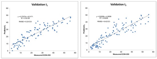 Figure 4 shows a comparison of predicted and measured CCI for I1 and I2 indices. The graphs correspond only to the index validation subdataset. It may be observed that both indices predicted CCI with a high degree of reliability. The RMSE values for I1 and I2, when applied to the control subdataset, were 6.23 and 6.42 CCI, respectively.