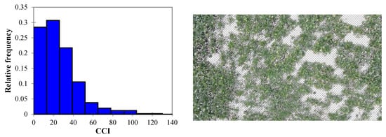 (Left) Histogram of CCI values (n = 500); (right) example of UAV-taken photograph after soil background removal.