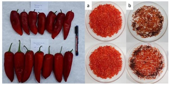 Whole organic (above) and conventional (below) sweet red peppers (left); (a)—fresh organic (above) and conventional (below) pepper shreds; (b)—dried organic (above) and conventional (below) pepper shreds.