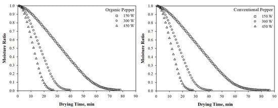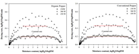 It is clearly seen that the drying rate was in an increasing trend at the early stage of the drying process (Figure 3). At 150 and 300 W, a relatively longer constant drying rate period was observed (no constant drying rate period at 450 W). In addition, the drying rate was in a decreasing trend (falling rate period) at the final stage of the drying process. After a short heating process during the early stage of drying, intermittent microwave drying process at 450 W (PR = 1.67; SIMP = 3.0 W g−1) for organic and conventional pepper shreds, the drying rate increased to a maximum and then, decreased without a distinct constant drying rate period. On the contrary, a relatively long constant rate period was visible at lower specific powers (1.0 and 2.0 W g−1), which corresponds to higher PR levels (PR = 4.93 for 150 W and PR = 2.47 for 300 W). As PR increased, the length of the constant drying rate period increased (Figure 3). This phenomenon could be due to the longer MW power off time (Toff), which provided longer rest time for better moisture and temperature distribution inside the product until the following MW on time (Ton). These findings are supported by various intermittent microwave drying studies [19,22,23,26,45,46].