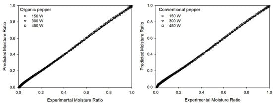 Experimental vs. predicted moisture ratios for different applied intermittent microwave drying powers for organic and conventional sweet red pepper samples.