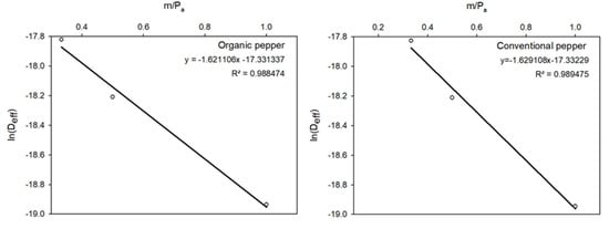 The pre-exponential factor of the Arrhenius equation (D0) explaining moisture diffusivity when temperature goes to infinity [56] was found to be the same for both product types (Table 6). The same trend was determined for the activation energy (Ea) values, which were computed from the slope of the Equation (6) by plotting ln(Deff) against m/Pa. The plots showed straight lines for the studied applied power range, which indicated Arrhenius dependence (Figure 5). Thus, the Ea values established from the slope of these lines were 1.62 and 1.63 W g−1 for the organic and conventional sweet red pepper samples, respectively (Table 7).