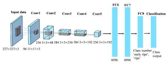Second, the main difference between MLP and CNN is the pooling layer. In such layers, the pixels of the neighborhood are added based on the permutation invariant function in CNN. This may prompt a certain amount of rendering invariance [33]. Then, the fully connected layers are usually added with constant weights after convolutional processing. Then, the softmax function is used to provide activation information in the last layer, resulting in a category assignment. A typical CNN architecture is shown in Figure 3 for identifying the ripeness of strawberry based on hyperspectral imagery [34].