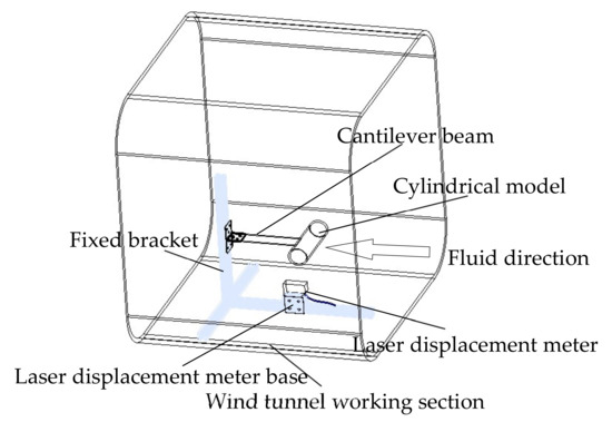 The experimental model is shown in Figure 3. The experimental model includes a fixed bracket, a cantilever beam, and a cylindrical model. The cantilever beam is laser-cut from aluminum sheet, the mass density of aluminum sheet is 2700 Kg/m3, and the elastic modulus is 72,000 Mpa; the cylinder is a transparent PC tube with closed ends, and the plastic tube has high impact strength and is not easy to deform; the experimental fluid is natural wind, laboratory air quality density is 1.2 Kg/m3. To ensure the reliability of the experiment, the cantilever beam and the fixed bracket are consolidated with screws, which can be disassembled without losing the flexibility of the experiment. One end of the cantilever beam is connected to the outside of the middle end of the cylindrical model. The cylindrical model does not twist around the nodes, and does not deform under the action of fluid. To ensure the reliability of the laser displacement meter measurement data, a laser displacement meter base installed on a fixed bracket was designed in the experiment. The base can move left and right with the support, and the laser displacement meter is fixed on the horizontal surface of the base through a cable tie. The signal point of the laser displacement meter is irradiated on the connecting end of the cantilever beam and the cylindrical model. The cylindrical model is subjected to VIV by the fluid to make the connected cantilever beams vibrate synchronously, so that the amplitude of the vertical vibration of the cylindrical model can be collected in real time. The experimental cylinder model is shown in Table 1.