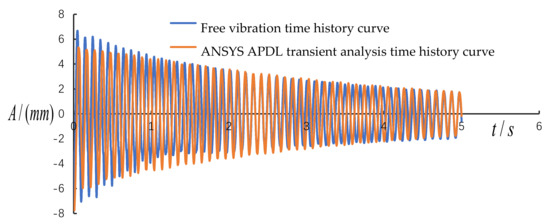 After calculating the damping ratio , through ANSYS APDL software transient analysis, the transient analysis time history curve is obtained, and it is used to compare with the time history curve of free vibration to verify the reliability of the experimental model again. As shown in Figure 5.