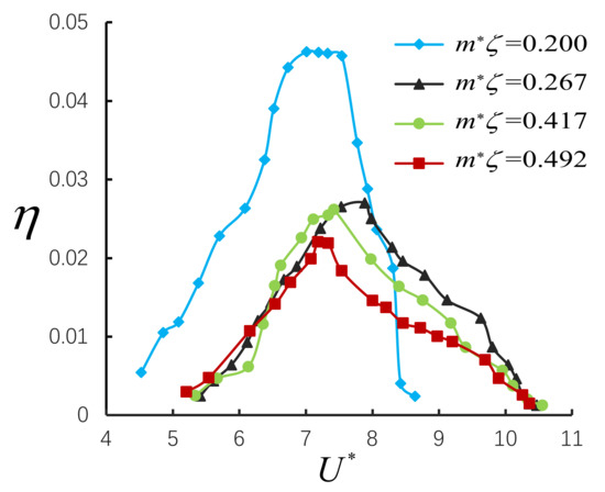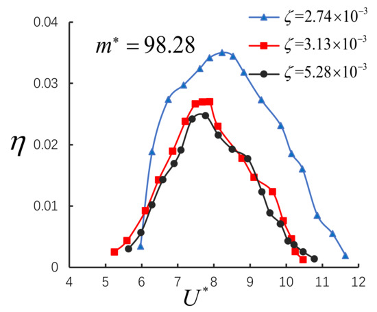 We can see from Figure 6 that the smaller the damping ratio , the larger the normalized amplitude of the cantilever beam connected to the cylindrical VIV, and the longer the resonance range of the reduced velocity . In fact, this is consistent with the results of the previous mathematical model. For large mass ratio,, the damping ratio is inversely proportional to , so the smallest damping ratio = 2.74 × 10−3, the largest normalized amplitude value appears in the experiment, as shown in Figure 6. When = 2.74 × 10−3, the maximum value of conversion efficiency is the largest, the maximum conversion efficiency value is 0.035. This seems to indicate that for large mass ratio, , the trends of and are the same with , and the damping ratio has a great influence on the maximum efficiency attainable. In fact, the maximum achievable conversion efficiency might be again be governed by the product . Results are presented in Figure 7.