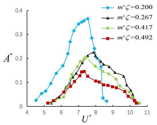 For large mass ratio,, from Equation (5) one can see that (the experiments show that , ). Then, one may deduce that, in this case, the normalized amplitude is a function of the product of the combined mass-damping parameter and the reduced velocity . For , however, Equations (4) and (5) are coupled, and hence should be a function of two independent parameters and , as well as .