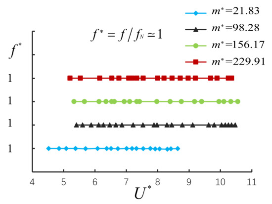 In the above experiments, the laser displacement meter recorded the time history curve data of the cantilever beam connected to the cylinder in each small experiment, and the data was transformed by FFT to obtain the resonance frequency . For , we get the change with the normalized flow velocity , as shown in Figure 10. For large mass ratio, , the normalized frequency , the locked state of VIV appears, the result is consistent with the established mathematical model.