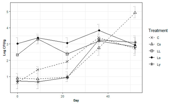 Aerobic bacteria cultivation based populations increased significantly in treatments with earthworms (Figure 2), and in the case of E and EL, bacterial populations were higher as from day 0 ( and 1.03 respectively p = 0.02848) thanks to the colonization that occurred during the pretreatment, while in CE, the presence of earthworms increased bacterial populations constantly from day 22 with an average of 2.65 to day 52 with a final count of 1.45 . The addition of amended soil also increased bacterial populations in treatments without earthworms, C and L began with 1.96 and on day 0 and reached a maximum of 2.98 and 3.3 respectively on day 36.