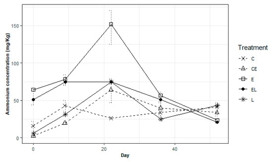 Ammonium reached higher concentrations in treatments with E. fetida [29] and L. sphaericus (Figure 4), and differences were greater on day 22 (p = 0.0218) with average ammonium concentrations of C: 26.3 miligrams per kilogram (mg/kgl), L: 75.0 mg/kgl, E: 152.3 mg/kgl, EL: 75.0 mg/kgl and CE: 64.33 mg/kgl. Earthworms with L. sphaericus inoculum reached only half of the concentration reached by earthworms without inoculum. This could be explained by a higher demand of ammonium for hydrocarbon catabolism by L. sphaericus and/or by ammonium concentrations reaching a threshold producing a transition from fixation to nitrification by L. sphaericus. The latter theory may be supported by the fact that L reached the same maximum ammonium concentration as EL (75.0 mg/kgl, day 22). Ammonium concentrations in bioremediation systems tend to behave cyclically thus, such studies can provide evidence to better understand the dynamics between nitrogen fixation and nitrifying bacterial populations and how ammonium and nitrate concentrations regulate this cycle [29].