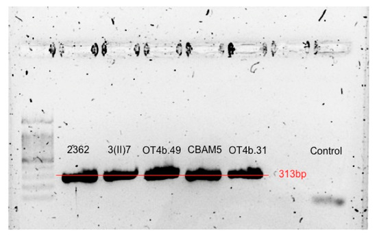 The primers used to amplify modB were designed by Angelica Cajamarca from the Center of Microbiological Research, Universidad de los Andes based on the genomic annotation conducted by Gómez-Garzón et al. [7] with an expected PCR product size of 312 bp. The amplification protocol for this gene started with 3 min of denaturation at 94 °C followed by 35 cycles each with 30 s of denaturation at 94 °C, touchdown annealing from 54 °C to 51 °C for 30 s and 1 min of extension at 72 °C, this protocol ended with 10 min of extension at 72 °C.