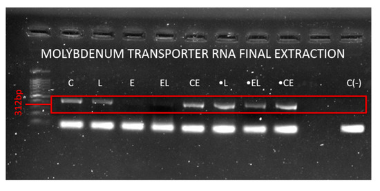 Soil and worm RNA extractions on day 52 amplified for molybdenum transporter in all samples except for soil RNA from E and EL (Figure 7). The expression of molybdenum transporter may indicate nitrogen fixation by L. sphaericus and this would explain increased ammonium concentrations in all treatments [7,8].