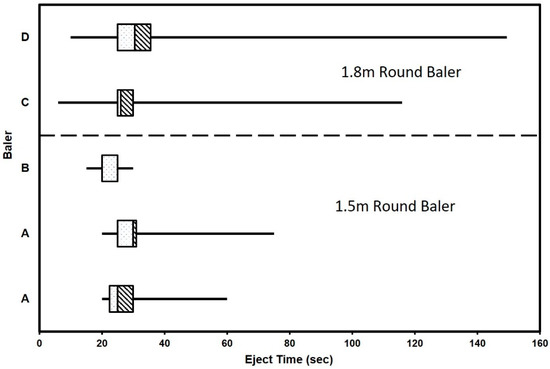 Baler performance data are summarized in Table 3. Average wrap-eject time for the 1.8 m diameter bales was 36 s, while the 1.5 m diameter bales were ejected in 27 s. In previous studies [25,26], the time to wrap a bale with net wrap was shorter than for wrapping a bale with twine. Only one round baler used in this study, Baler D, used baling twine. The wrap-eject time for Baler D was 41 s compared to 31 s for the same size bale covered with net wrap (Baler C). Figure 2 shows the “Box-Whisker” graph of the ejection time for the round balers. This figure does not show the wide difference in average ejection times between the balers. Since Field 3 was baled with a large-square baler, no ejection time is needed since the baler continues to bale while the previous bale is being tied.