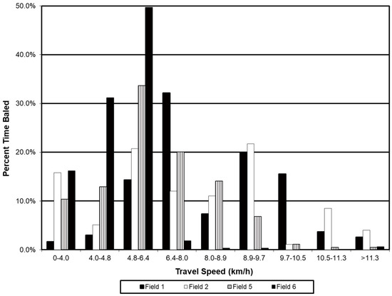 Speeds for Fields 1, 2, 5, and 6 averaged 8.9, 8.2, 7.0, and 5.9 km/h, respectively (Figure 3). This shows that the larger round baler was faster than the smaller baler. There was less variability in Field 6 than other fields. Fields 1 and 2 had a bi-modal distribution (two peak speeds) this was probably due to the field shape (irregular) and small size which influenced the operator’s traffic patterns.