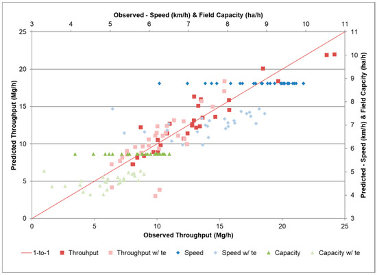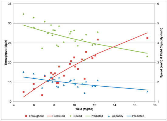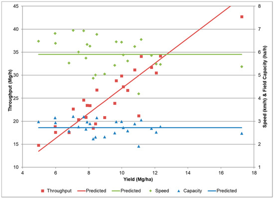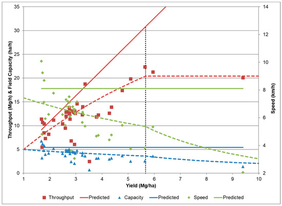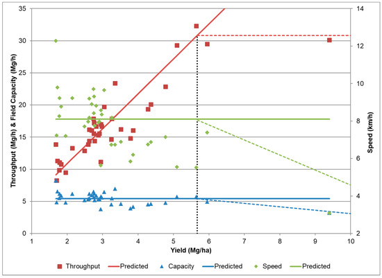 Throughput reached a maximum capacity. The relationship of the performance data to yield from Field 2 is shown here. Productivity data does not include time spent wrapping and ejecting the bale. The individual points are observations from field data. The solid and dash lines (green—effective speed, red—throughput, blue—achieved field capacity) are predicted [4] assuming ve = 11.0 km/h, Ef = 0.74, and Ws = 6.7 m.
