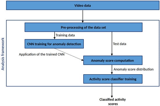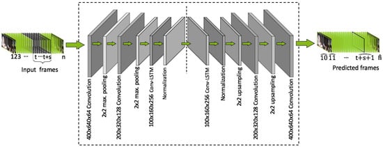 Our proposed model follows a convolutional autoencoder structure, which is intensively used for unsupervised and semi-supervised anomaly detection tasks [40,41,42]. Anomaly detection itself is a well known area in machine learning and video motion analysis is becoming more and more important due to the increased use of video surveillance systems [40,43]. In general, anomaly detection aims to find atypical patterns that do not match the expected normal patterns, which constitute the majority of the data [44]. By defining an expected behavior pattern as the normal behavior, the detection of an anomaly corresponds to the detection of atypical patterns and can be used, for example, for activity recognition and classification [43]. For images and videos, the task of finding an anomaly is challenging due to the high dimensional structure and the non-local temporal variations [40]. In line with earlier studies [45,46,47,48], we implemented a predictive CNN network, by approximating the next video frame Xt given a series of the past q frames [Xt−1, Xt−2, …, Xt−q], in which it learns the visual activity patterns included in video sequences [49]. For our analysis, the CNN is trained entirely on normal behavior patterns in the form of low activity sequences that correspond to resting behavior at night. For each camera, five videos with a length of 30 min each were used for training. This step enables the model to accurately forecast the next video frame. However, the prediction accuracy of future frames with high activity patterns is decreased, as the model lacks the necessary information to predict these patterns [50]. As a result, those frames are categorized as anomalous events based on the corresponding Mean Squared Error (MSE) score (Equation (1)) between the predicted video frame and the true frame as the model loss function [48].
