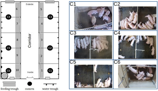 Video recordings from six cameras monitoring ten pig pens were taken in a research trial between March 2017 and March 2018 at a research facility of the Christian-Albrechts-University in Kiel, Germany. For the recordings, each camera of the type AXIS M30-VE was assembled 2 m above the pig pens. An overview of the pen arrangement, the camera placement and an example image of each camera are presented in Figure 2.
