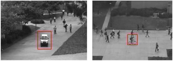 Sample from the UCSD 1 (left) and the UCSD 2 (right) data set. The red rectangle highlights an anomaly in the form of a small vehicle and a cyclist, respectively.
