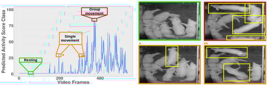 By analyzing multiple videos and predicting an activity class for each frame we found that our framework is able to detect varying types of behavior like lying, standing, walking or running. Figure 5 shows an example video analyzed by our model. Our analysis showed that the range of the predicted activity score class for the corresponding frames was low during a resting phase in which no activities occurred. In contrast, the more the animal activity increased and the more pigs became active, the higher was the predicted class. In particular, a maximum score of 100 was reached for situations, in which all pigs showed strong interactions with intense activity levels.