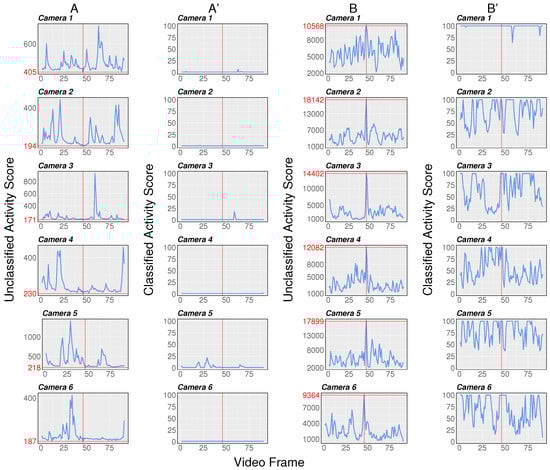 Comparison of unclassified activity scores (A,B) and their assignment into activity score classes (A’,B’) for videos of lower (A) and higher (B) activity intensities. The 90-second sequences are centered around the minimum activity score value for the sequences in (A) and maximum activity score value for the sequences in (B) indicated by the vertical red line.