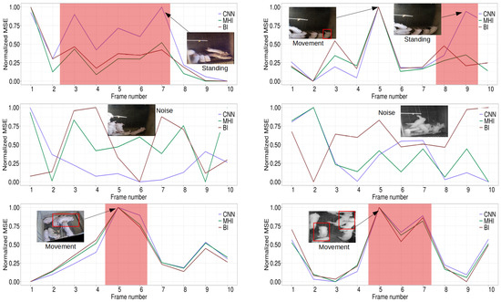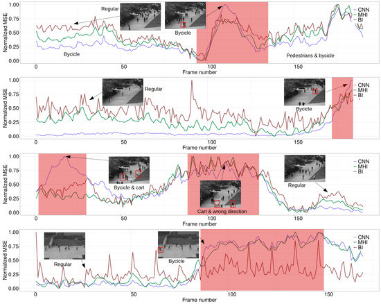 To compute the MHI, we applied a sliding window on each test sequence and compared two consecutive frames extracted in time t and based on their MSE values (Equation (1)). Similarly, for the binary image approach we followed the study of Ott et al. [35] and Tsai et al. [36]. First, we performed background subtraction and created a binary image for each video frame in the test set. After that the squared differences between consecutive binary images in time t and were calculated. Subsequently, we applied our CNN on the same sequences after learning the regular movement behavior from the training set and compared the results.