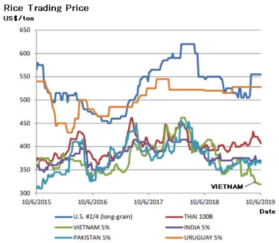 Rice Trading Prices of major rice exporting countries from 2015 to 2019. Vietnamese rice price is always close to the bottom level. Source: created from the data of the United States Department of Agriculture (USDA) [,].