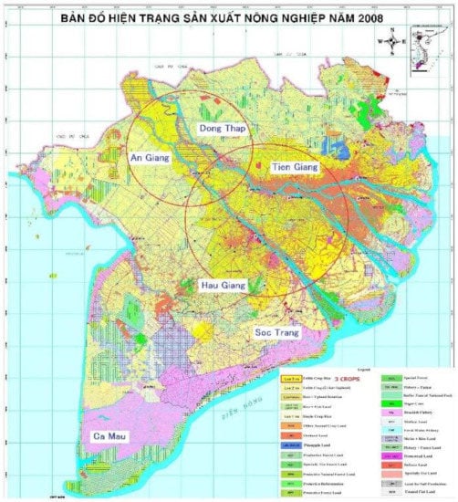 Mekong Delta Agricultural land use map (2008). * The yellow-colored area is for rice cultivation, and circled areas are mostly triple cropping areas. Land use areas have not changed for most of the Mekong Delta areas since this 2008 map up to 2014, except for some expansion of triple cropping areas from two cropping areas by irrigation system improvements. Source: Southern Institute for Water Resources Planning (SIWRP) [].