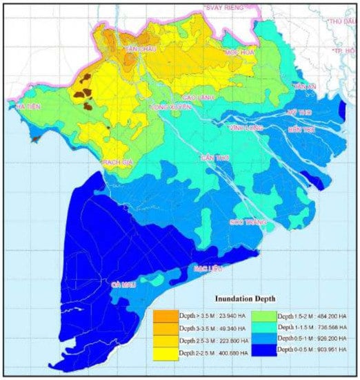 Inundation map of the Mekong Delta in 2000 floods. Orange and yellow colored areas (An Giang and Dong Thap province) often suffer heavy floods in the rainy season (inundation in 2000 was serious, and water depth was 2.0–3.5 m). Source: Southern Institute for Water Resources Planning (SIWRP) [].