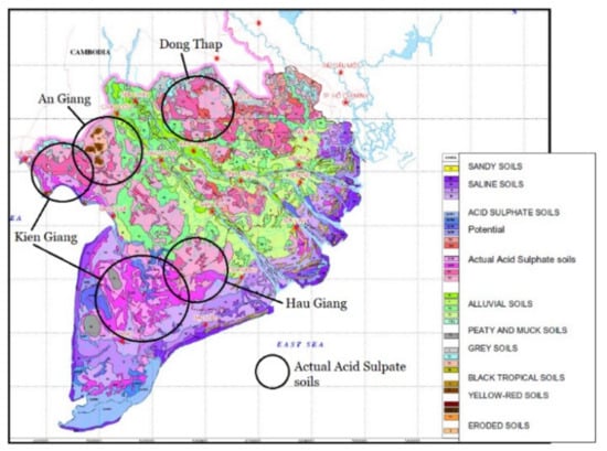 - SIWRP. Soil map of the Mekong Delta. In Vietnam-Netherlands Mekong Delta Masterplan Project; Draft Report on Water for Food in the Mekong Delta; Southern Institute for Water Resources Planning (SIWRP): Ho Chi Minh, Vietnam, 2010; p. 19. Available online: http://www.maruyama.co.jp/english/asia/products/largescalesprayer.html (accessed on 10 October 2020).
