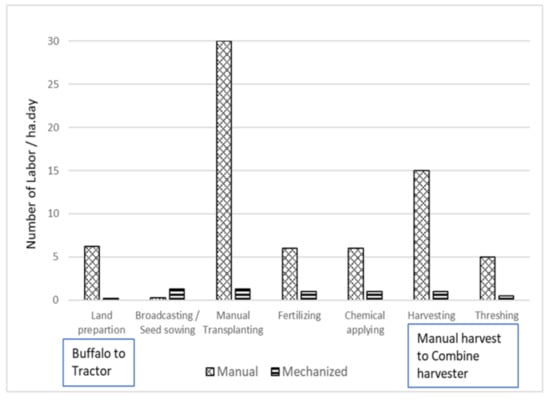 Required number of labor for one ha, done in one day for each process of rice cultivation. This figure is a brief image of farmers with whom we interviewed, and we picked up data from other reports from the FAO and IRRI (International Rice Research Institute); however, these numbers are not measured scientifically. Source: Authors’ survey, also FAO [] and IRRI [] information.