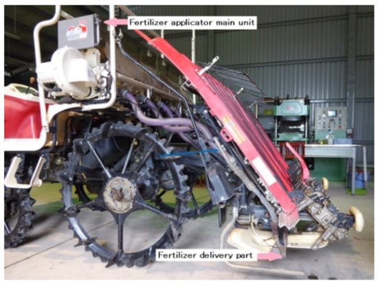 Fertilizer applicator mounted on a rice transplanter. Side strip fertilization device is equipped, fertilizer to be delivered to the beneath of the soil. Source: Photo was taken by the author at Can Tho city in December 2019.
