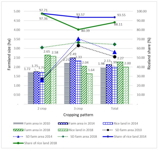 According to the survey data (420 farms) of the authors in 2014 and survey data (600 farms) of the Mekong Delta Development Research Institute of Can Tho University (MDI-CTU) in 2018, farmland size per farmer household in the Mekong Delta increased from 2.13 ha in 2014 to 2.27 ha in 2018; among them, farmland in two crop areas increased remarkably from 1.75 ha in 2014 to 2.65 ha in 2018. However, rice paddy land share in all the farmland decreased from 93.55% in 2014 to 88.11% in 2018; especially, rice land share in three crop areas dropped from 93.57% in 2014 to 80.39% in 2018 [,] (Figure 16). We understand this is partly influenced by the government’s instruction for farmers to change their production items from rice to other profitable crops.