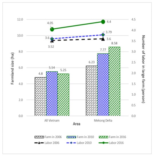 Change of registered large farms from 2006 to 2016. Farmland size/farm and amount of labor/farm in all Vietnam and in the Mekong Delta. Source: created from GSO 2013, 2016 [,].