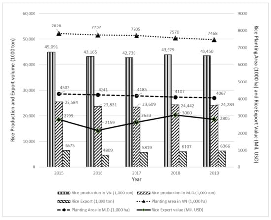 Nevertheless, even though the Vietnamese government recommended farmers to shift rice production to other profitable crops, total paddy area in all Vietnam and Mekong Delta decreased very little from 2015 to 2019. Rice production volume also keeps almost same numbers (Figure 18) [,,,].