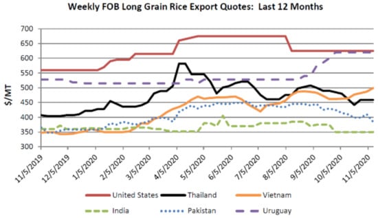 - Grain: World Markets and Trade November 2020. USDA. 2020. Available online: https://usdasearch.usda.gov/search?utf8=%E2%9C%93&affiliate=usda&query=rice+trading+price&commit=Search (accessed on 27 November 2020).