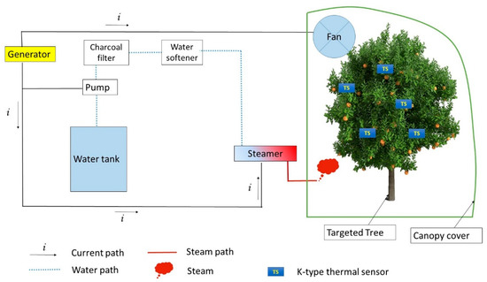 Schematic diagram of mobile thermotherapy system for heat-treating huanglongbing (HLB)-affected trees in the field [4].