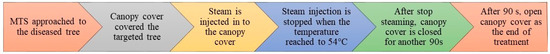 A mobile thermotherapy system (MTS) for treating HLB-affected trees was developed and utilized in the Southwest Research and Education Center of the University of Florida [4]. The performance of the MTS has been evaluated in citrus orchards using thermocouples and by measuring the survival ratio of surrogate bacteria [4,8]. The MTS covers the targeted tree with a retractable canopy cover and steam generated by a steamer (Sioux Corporation, Model #SF-11-3800 Beresford, SD, USA) is injected to the canopy cover. The schematic diagram of the MTS is shown in Figure 1. Eight nozzles for injecting steam were positioned to control the fluid flow direction and velocity, thereby evenly distributing the heat inside the canopy cover. The steam nozzles on the closed cover are near the soil surface as the steam flows upward. Steam injection was stopped when the temperature inside the canopy cover reached the targeted temperature of 54 °C, and the canopy cover stayed closed for another 90 s to complete the treatment process (Figure 2). This optimal combination of temperature–time as 54 °C for 90 s was found by Czarnecka et al. (2018) for treating the bacterial pathogen L. asiaticus which causes citrus greening [7].