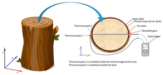 Cross-section of the sample with thermocouples installed in the phloem and on the surface.