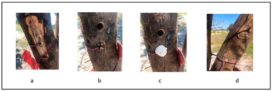 The average bark thickness of a branch around each cross-section was measured. A hole was created through the tree texture and the depth of the hole was measured by the depth-measuring blade of the caliper. The depth of the hole was equal to the difference of each cross-section diameter and bark thickness (e.g., according to Table 1, the depth of the hole for medium diameter was 24.15 mm because 25.19 − 1.04 = 24.15 mm). For measuring the temperature during in-field treatments, the temperature of each experimental sample was measured with two K-type thermocouples (±0.2 °C). One thermocouple was placed inside the hole, under the bark (in the phloem), and the other was attached outside of the tree, as shown in Figure 3 and Figure 4. When the hole was large, the gap was filled by pieces of branches to create a similar texture and prevent air filling the gap and affecting thermal properties (Figure 4a,b). The hole was sealed with moldable glue (Figure 4c). The second thermocouple was installed outside the bark, close to the thermocouple inside the hole (Figure 4d). Thermocouples were connected to an Omega RXL12SD 12-channel temperature recorder (Omega Engineering, Stamford, CT, USA) that stored data from each thermocouple into an SD card at a logging frequency of 1 Hz.