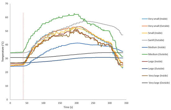 The temperature variation on the surface (Outside) and in the phloem (Inside) of the five diameter categories during the experimental heat treatment; Very small: Small; Medium; Large; and Very large. (red dashed line illustrates the starting point of injecting steam).