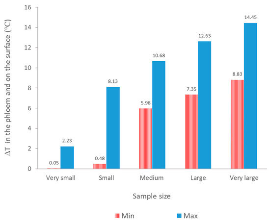 Figure 6 shows the maximum and minimum difference of the temperature inside the phloem and on the surface of the tree for five sample categories (from the moment of starting to inject steam to ending the treatment by opening the canopy cover). The mean and standard deviation of temperature difference for all experiments are shown in Table 3. As the diameter increases, the thickness of the bark increases, and hence a thicker heat isolation layer is generated; the thickness of the cortex is higher with a longer column of cells. Therefore, the physical properties and topology of the bark reduce the heat transfer. Moreover, the tree bark surface is not smooth, and there is some area in which air is trapped and which decreases the level of heat transfer [27].