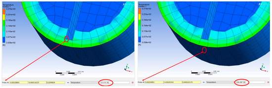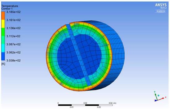 To further study the heat penetration inside a tree, the “Medium” diameter category was selected as a representative case study for simulation analysis and evaluation as all samples in different categories showed a similar response, as verified by Ghatrehsamani et al. [4,8]. The ANSYS 19.2 (ANSYS Inc., Canonsburg, PA, USA) software is commonly used for finite element analysis, including to simulate heat and temperature distributions. In this study, the solutions of the presented heat diffusion equations were obtained using ANSYS and the parameters presented in Table 2. The temperature distribution through a sample cross-section is shown in Figure 7.