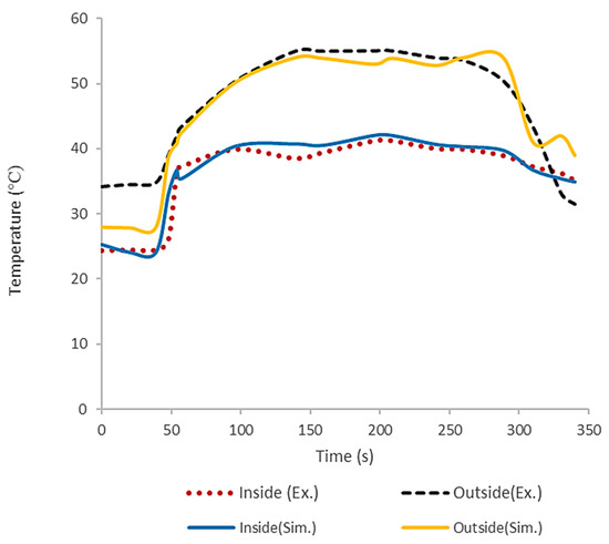 where ρ is the density (kg/m3), c is the special heat capacity (J/(kg·K)), and t is time (s). The initial temperature of the sample wall was considered as the environment temperature on the day that the experiments were conducted. An initial uniform temperature of 28 °C was used for the simulations. Representative equations considered as follows for the definition of boundary conditions; Equations (3) and (4):