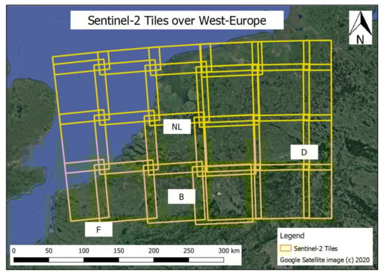 Extents of study area including all 28 Sentinel-2 tiles covering The Netherlands (NL), Belgium (B) and a part of France (F) and Germany (D).
