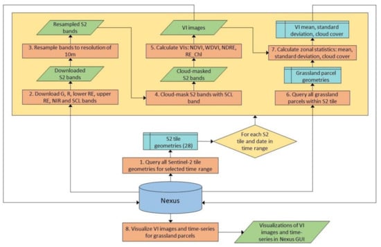 Flowchart containing processes for querying, harvesting, pre-processing, uploading, and visualizing Sentinel-2 (S2) data and vegetation indices (VI) for each S2 tile of 100 × 100 km2 and date in time range, as part of the Sen2Grass system, with the Nexus server as a central geodatabase.