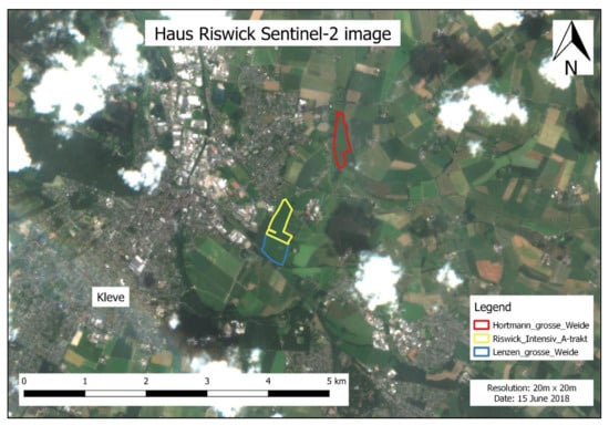 As mentioned in Section 2.1, the Sentinel-2 tiles also cover a part of west Germany, including the city of Kleve in the state of North Rhine-Westphalia (NRW). Just to the east of that city, one of the two experimental and educational institutions of NRW’s Landwirtschaftskammer (Chamber of Agriculture), called Haus Riswick, is located. Some of Haus Riswick’s main activities include the training of farmers, students and consultants in cattle breeding, developing novel technologies for improved dairy production and running trials on grassland parcels to improve crop yield while reducing environmental impact [51].