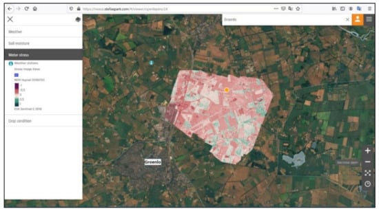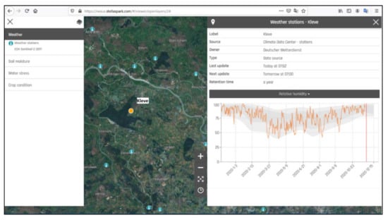 Graphical output for many kinds of environmental phenomena is being created in the back end of the Nexus platform and is visualized in an online web portal in an interactive way (Figure 4). Among other information, this includes information about drought monitoring, data coming from weather stations, and fertilizer application rates [35]. For instance, when clicking on the location of a weather station, in this example close to Kleve, Germany (top image of Figure 4), a pop-up menu like the one on the right of the screen will appear, showing in this case a time series of relative humidity for the area of Kleve between January and December 2020. Also, other visualizable weather parameters were available in that menu, such as daily precipitation and mean daily temperature, similar to the results for the case study of Haus Riswick presented in the next subsection. In addition, it was also possible to depict images of vegetation index on the Nexus web portal, such as the NDVI image for a region in the east of the Netherlands (bottom image of Figure 4), which was recorded in July 2018 with help of an Unmanned Aerial Vehicle (UAV) containing a camera with a very high spatial resolution.