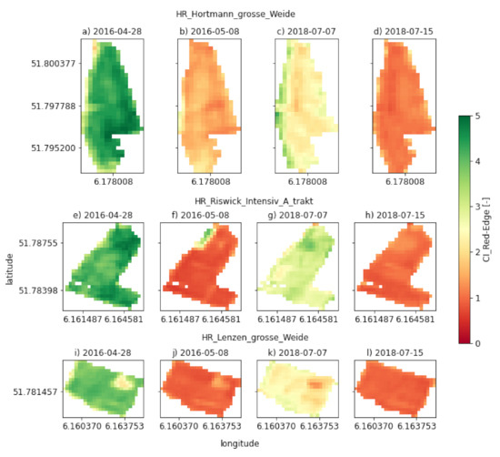 Vegetation index images (CIRed-Edge) for the three parcels Hortmann grosse Weide (a–d), Riswick Intensiv A-trakt (e–h), and Lenzen grosse Weide (i–l), which are shown in pairs: just before and right after harvest for selected dates in the growing seasons of 2016 and 2018.