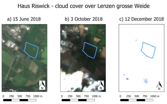 Cloud cover over Haus Riswick’s Lenzen grosse Weide parcel: cloud-free (a); hindered by cloud shadows (b); and fully covered with clouds (c).