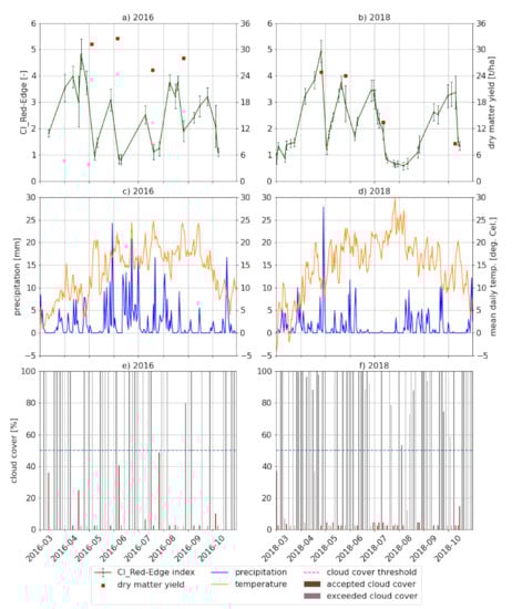 Time series over growing seasons 2016 and 2018: CIRed-Edge index and dry matter yield for parcel Lenzen grosse Weide (a,b), total precipitation (mm) and mean daily temperature (deg. C) for the area of Kleve (c,d), and cloud cover percentages for parcel Lenzen grosse Weide (e,f).